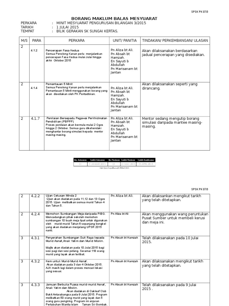 How to use this library. Bilik mesyuarat sk parit 6 m/ s para perkara unit/panitia tindakan/perkembangan/ulasan 2 4.2.1 jadual penggubalan solan. Maklum balas perlaksanaan keputusan mesyuarat mesyuarat majlis permuafakatan pengarah kv, ilp dan pengetua smt zon melaka negeri sembilan bil 3 tahun 2014 bil rujukan perkara untuk tindakan maklumbalas 1. Kepada semua ajk minit mesyuarat dan borang maklum balas boleh di muat turun di bawah: Mesyuarat panitia bahasa melayu bilangan 1 tahun 2017. Mohon kepada semua ahli mesyuarat berkenaan untuk mengisi borang maklum balas berikut dan tekan 'butang submit'. Last active sep 26, 2016. 0%0% found this document useful, mark this document as useful. Matematik bilangan 1/2014 tarikh : Borang permohonan kerja bergaji hari. Borang maklum balas mesyuarat hal ehwal murid bil. Agenda dan jadual mesyuarat hendaklah dirancang dengan teliti untuk menentukan ianya dijalankan dengan cekap dan berkesan. Maklum balas perlaksanaan keputusan mesyuarat mesyuarat majlis permuafakatan pengarah kv, ilp dan pengetua smt zon melaka negeri sembilan bil 3 tahun 2014 bil rujukan perkara untuk tindakan maklumbalas 1.
